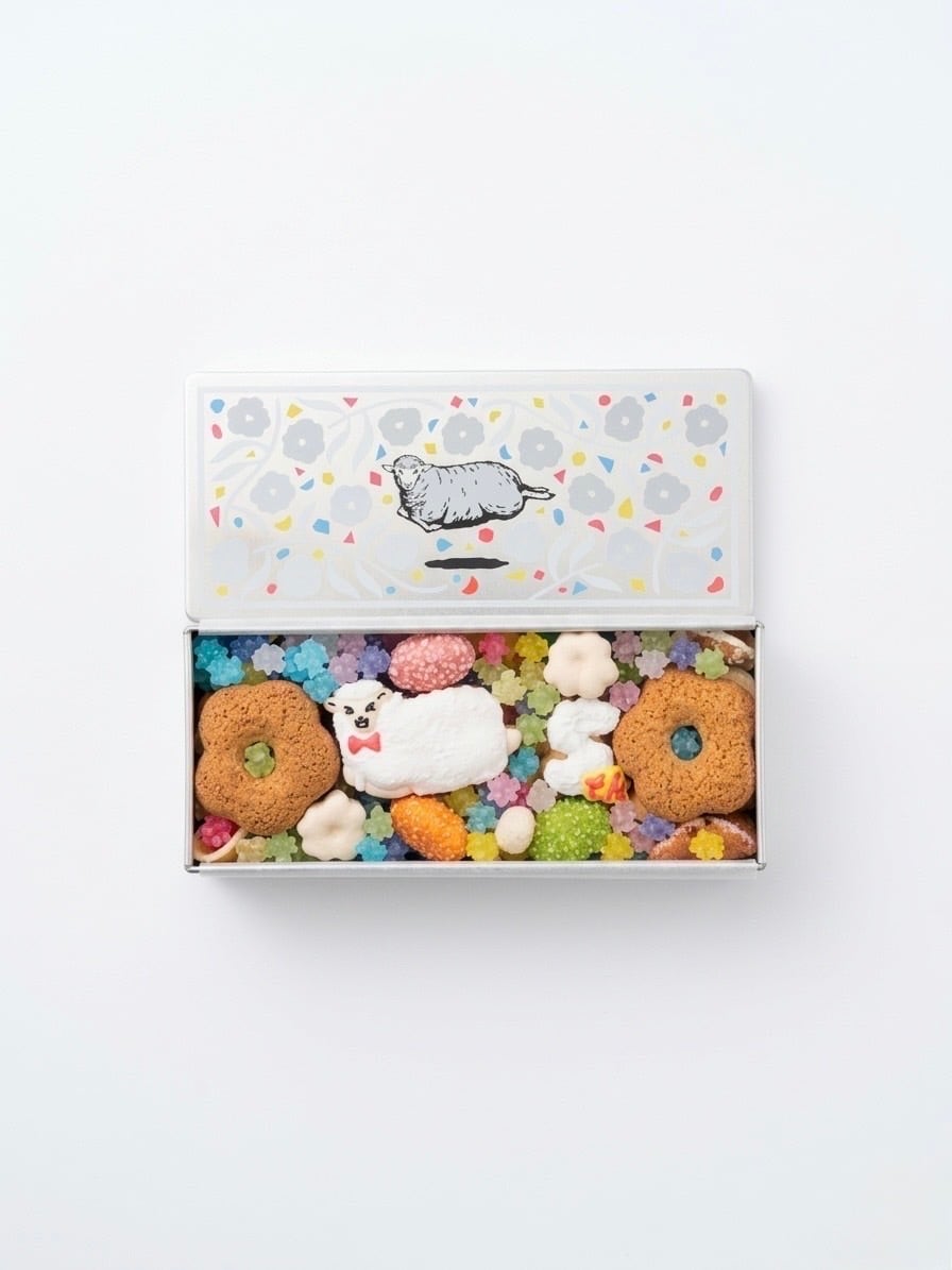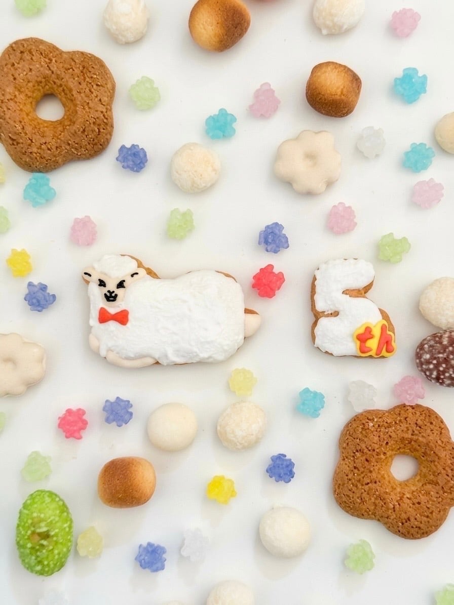 蝶ネクタイでおめかしした「ひつじさん」と、5周年のアニバーサリーロゴのアイシングクッキーを詰め込みました。
