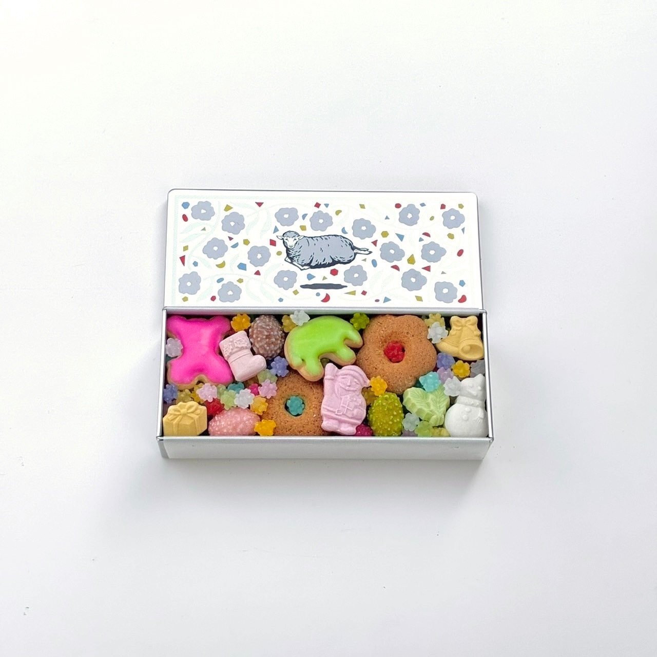 クリスマスモチーフの和三盆に、動物のカタチをしたビスケット、色んなお味を楽しめる金平糖など7種のお菓子をお詰めいたしました。