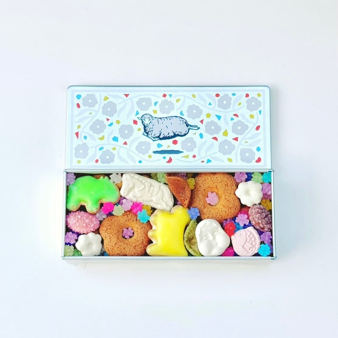 原材料名:金平糖(砂糖(国内製造))、姫ぼたん(馬鈴しょでん粉(国内製造)、砂糖、卵、はちみつ、小麦粉、脱脂粉乳、ブドウ糖、水あめ)、生姜ぼうろ(小麦粉(国内製造)、馬鈴しょでん粉、卵、砂糖、水あめ、生姜)、四季の花(砂糖(国内製造)、小麦粉、ショートニング、ごま、ココアパウダー、食塩)、アニマルよーち(ビスケット(小麦粉、砂糖、ショートニング、ブドウ糖、食塩、乳等を主要原料とする食品)(国内製造)、砂糖、でん粉、ゼラチン)、おつまみ(砂糖(国内製造)、小麦粉、卵、上新粉、ブドウ糖、脱脂粉乳、コーンスターチ、生姜、ごま、シナモン、しそ、抹茶)、和三盆(和三盆糖(国内製造)、澱粉)、そばぼうろ(小麦粉(国内製造)、砂糖、卵、そば粉)/膨張剤、香料、着色料(カラメル、紅麹、パプリカ色素、赤3、赤106、青1、黄4、黄5)、増粘剤(加工でん粉)、(一部に小麦、卵、乳成分、そば、ゼラチン、ごま、大豆を含む)