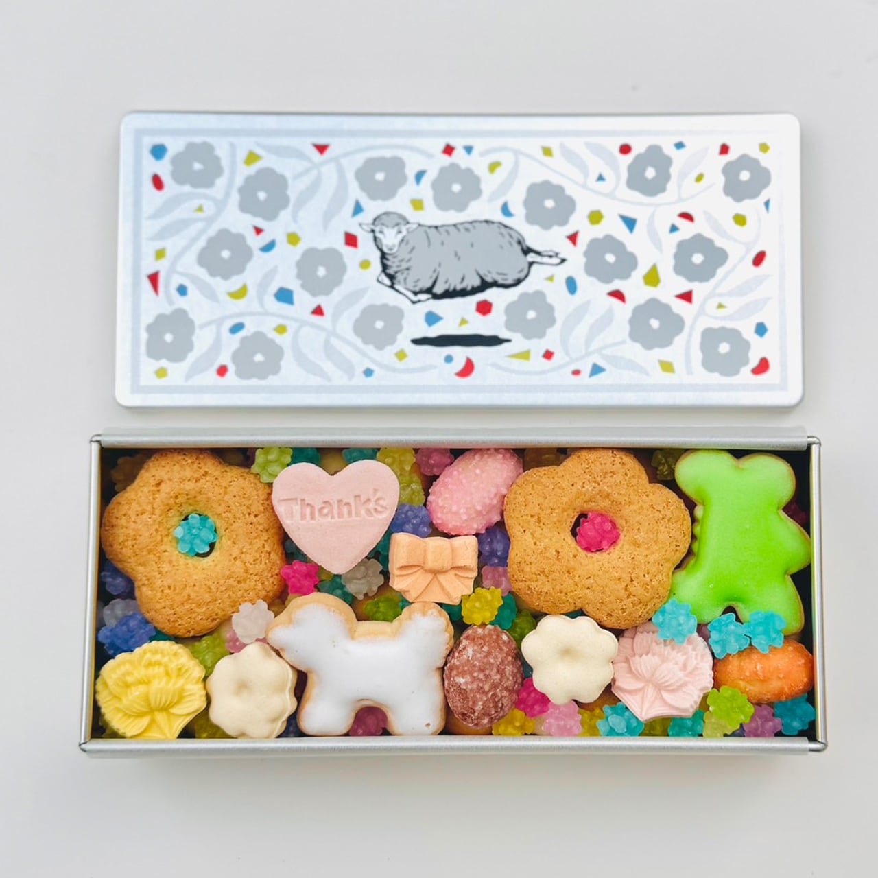 吹寄せ●名称:菓子●原材料名:金平糖(砂糖(国内製造))、姫ぼたん(馬鈴しょでん粉(国内製造)、砂糖、卵、はちみつ、小麦粉、脱脂粉乳、ブドウ糖、水あめ)、生姜ぼうろ(小麦粉(国内製造)、馬鈴しょでん粉、卵、砂糖、水あめ、生姜)、四季の花(砂糖(国内製造)、小麦粉、ショートニング、ごま、ココアパウダー、食塩)、アニマルよーち(ビスケット(小麦粉、砂糖、ショートニング、ブドウ糖、食塩、乳等を主要原料とする食品)(国内製造)、砂糖、でん粉、ゼラチン)、和三盆(和三盆糖(国内製造)、澱粉)、そばぼうろ(小麦粉(国内製造)、砂糖、卵、そば粉)/膨張剤、香料、着色料(カラメル、パプリカ